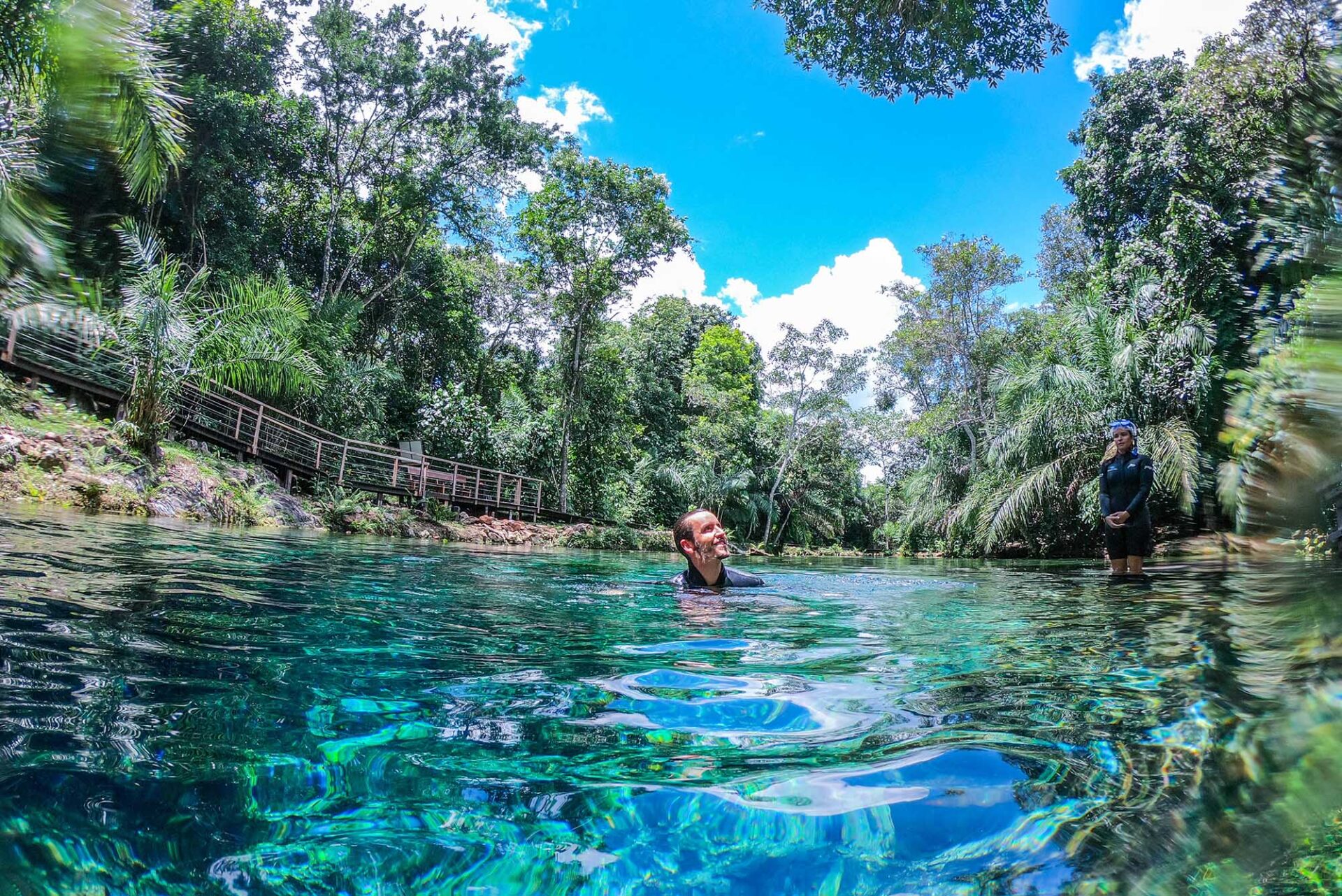 Quem quiser pode flutuar nas águas cristalinas. Mergulhadores certificados podem aproveitar para seguir até 18 metros de profundidade. O cenário é deslumbrante, com estalactites e estalagmites de formas variadas. Além disso, a água do local tem coloração exuberante. Os interessados devem fazer um treino de rapel simples antes do passeio.
