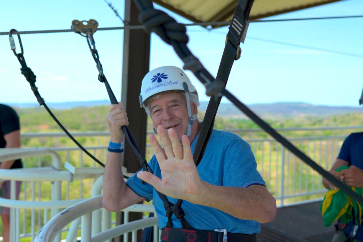 Seu David, de 78 anos, viveu um momento inesquecível ao se aventurar na tirolesa da Nascente Azul, mostrando que a idade não é limite para quem busca conexão com a natureza